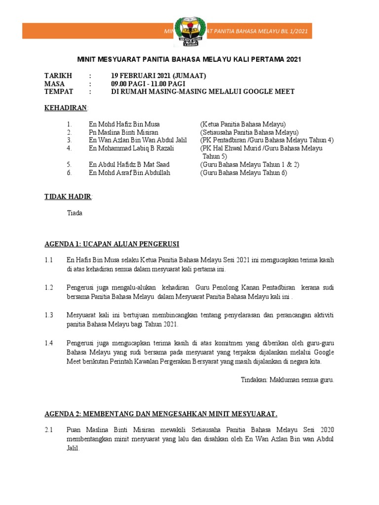 1 Bagi pihak pengerusi mesyuarat boleh mulakan mesyuarat dengan kata kata alu-aluan dan boleh masukkan juga beberapa makluman terkini yang boleh disampaikan dalam mesyuarat. View 12021docx from ENGLISH 123 at Sekolah Menengah Kebangsaan Abdul Jalil. Koleksi Lengkap Minit mesyuarat bahasa melayu.
