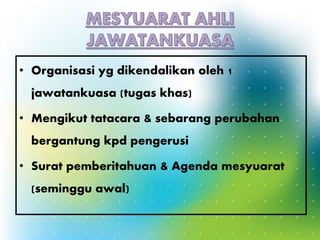 PERANAN DAN TANGGUNGJAWAB AHLI JAWATANKUASA MESYUARAT JENIS-JENIS MESYUARAT Dibentang oleh Siti Amira binti Sallehudin MESYUARAT AGUNG 1 kali 1 tahun Rencana. Merekod dan mengemaskinikan segala perbelanjaan yang dilakukan. Minit disimpan selama tujuh tahun bagi maksud pemeriksaan oleh seorang pegawai keselamatan dan kesihatan pekerjaan.