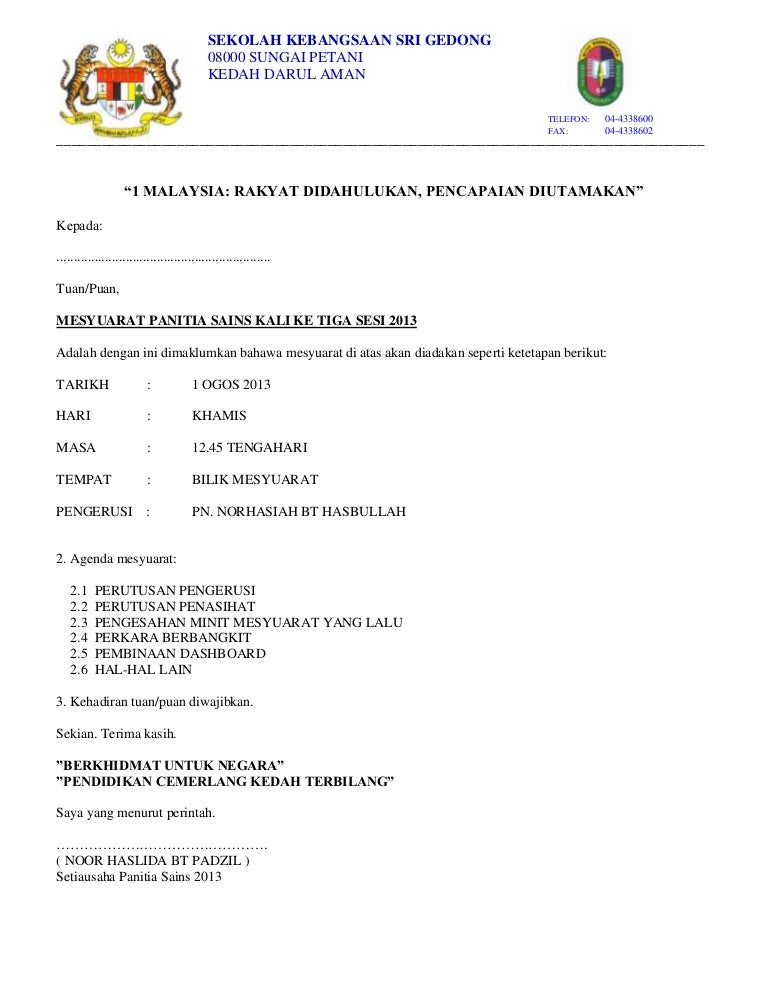 Siti hanisah binti abd rahman setiausaha hem guru kelas 1 geniustidak hadir dengan. Contoh 1 Minit Mesyuarat Panitia Sain. 1230 Tengah Hari Tempat.