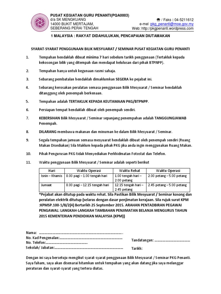 Syarat Syarat Penggunaan Kemudahan Bilik Mesyuarat Dan Seminar Pkg1 Pdf
