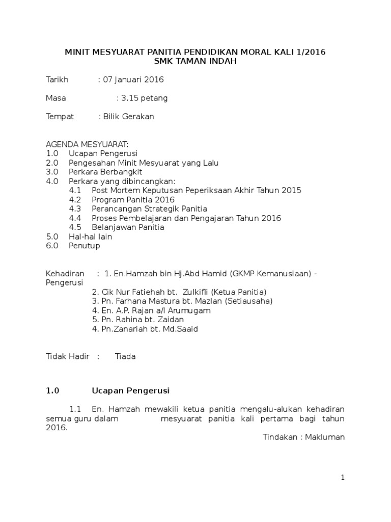 Minit mesyuarat ialah satu hal atau perkara yang telah dibincangkan dalam sesuatu mesyuarat dan persetujuan telah dicapai terhadap perbincangan tersebutIni bermakna catatan minit mesyuarat amat penting bagi membolehkan tindakan dapat dilaksanakan oleh pihak-pihak yang terlibat dengan. Minit mesyuarat bahasa inggeris. En Hamin bin Ahmad Ketua Panitia Guru Muzik Thn 4 5 dan 6 2.