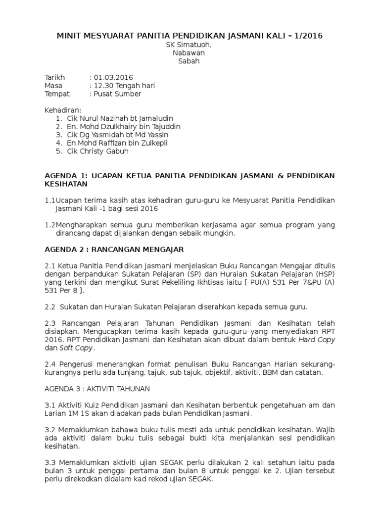 Minit Mesyuarat Panitia Pendidikan Jasmani Kali 1 Pdf
