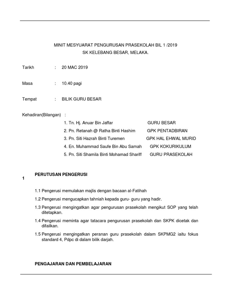 Minit Mesyuarat Pengurusan Prasekolah Bil 1 2019 Pdf