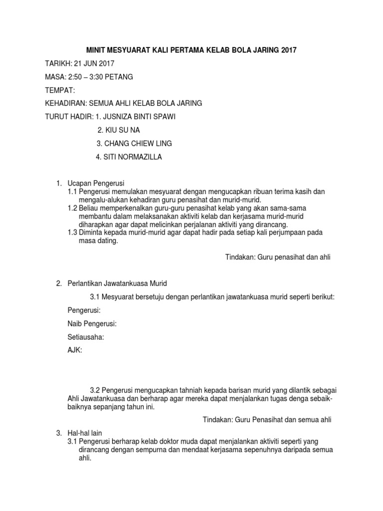 View flipping ebook version of MINIT MESYUARAT GURU KALI PERTAMA 2020 published by zaimahmohamed164 on 2020-06-17. Contoh Minit Mesyuarat Jawatankuasa Kurikulum Kali Pertama SK Sungai Rokam. MINIT MESYUARAT BILANGAN PERTAMA TAHUN 2014 Hari Tarikh.