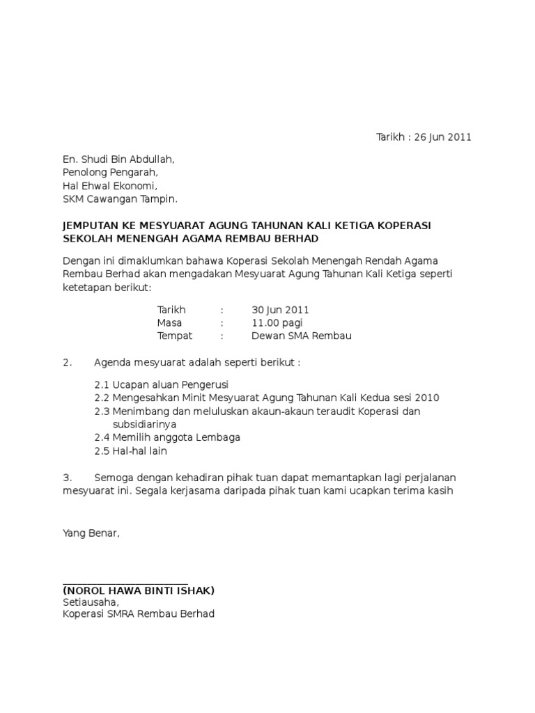Contoh Surat Jemputan Mesyuarat Agung Untuk Yb - Contoh surat jemputan mesyuarat umno cawangan 22nd may 2009 tun razak city campus kuala lumpur. TuanPuan MESYUARAT GURU KALI KE PERTAMA Dengan segala hormatnya saya diarah merujuk perkara di atas. Contoh surat panggilan mesyuarat syarikat.
