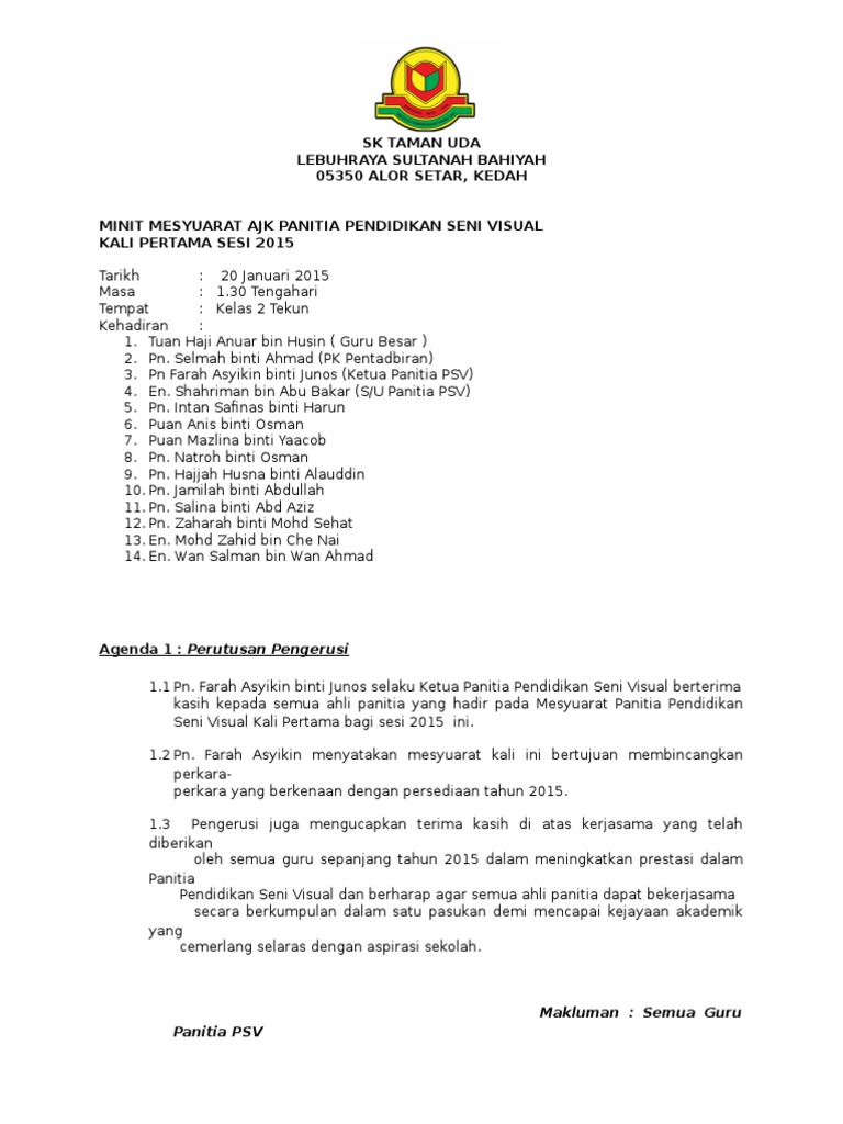 Minit Mesyuarat Panitia Pendidikan Seni Visual Kali Pertama 2015 Pdf