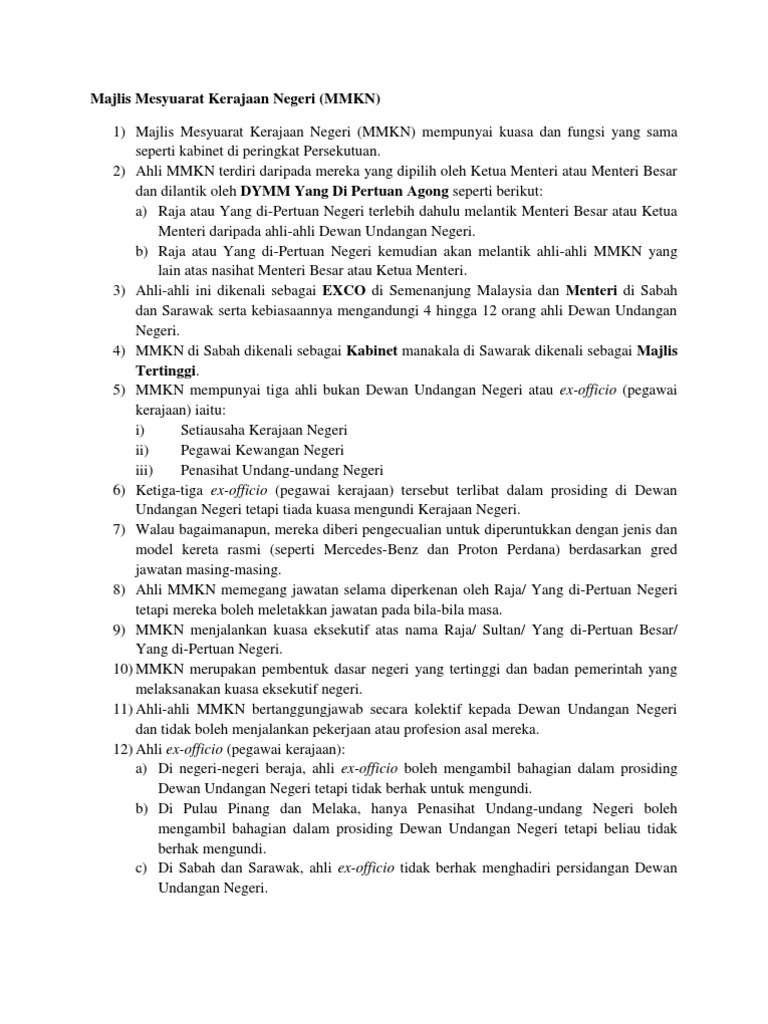 Jabatan Agensi e. Kalau para pelajar telah faham proses di peringkat persekutuan adalah mudah bagi anda memahami kedudukan Majlis Mesyuarat Kerajaan Negeri yang menyerupai kabinet di peringkat Persekutuan. Baginda boleh menitahkan Majlis Raja- Raja mengadakan mesyuarat bagi membincangkan keistimewaan kedudukan kehormatan kemuliaan Raja-Raja Melayu.