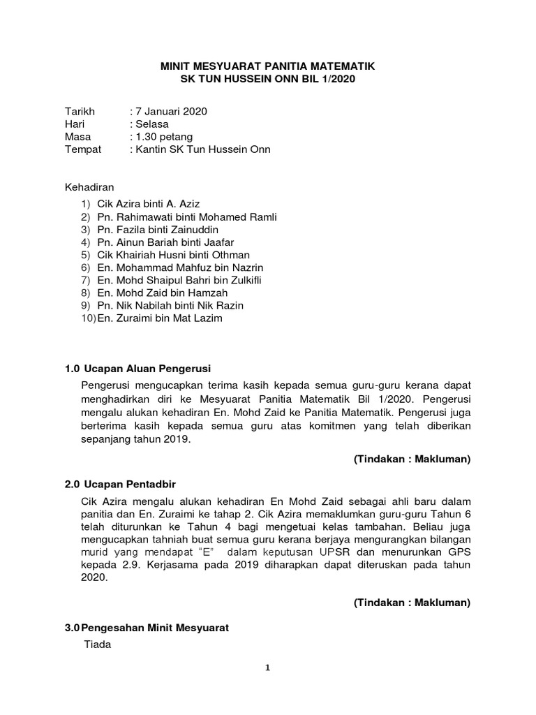 Contoh minit mesyuarat panitia matematik kali pertama. Minit mesyuarat ialah satu hal atau perkara yang telah dibincangkan dalam sesuatu mesyuarat dan persetujuan telah dicapai terhadap perbincangan tersebutIni bermakna catatan minit mesyuarat amat penting bagi membolehkan tindakan dapat dilaksanakan oleh pihak-pihak yang terlibat dengan. Dewan Lestari Sk Labung KEHADIRAN 1. Minit mesyuarat kali ke tujuh 8.