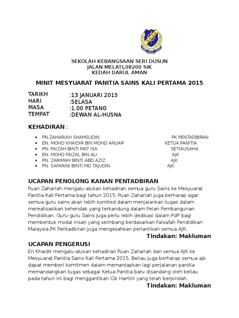 Minit Mesyuarat Panitia Sains Kali Pertama Pdf